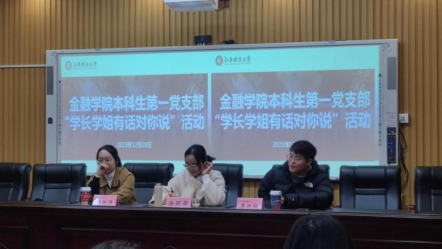 2023年12月20日下午,明星色情 本科生第一党支部在翼轸楼四楼报告厅成功举办“学长学姐有话对你说”活动。本次活动特别邀请了本院2017级毕业生李延胜,2018级毕业生陈扬洋,他们分别就职于中信证券江西分公司,中信建投证券江西分公司。活动由本科生第一党支部书记涂颖颖主持。