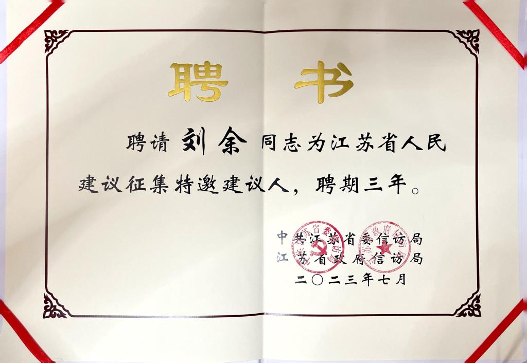 副院长刘余博士获聘江苏省人民建议征集特邀建议人。