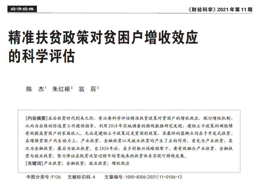 朱红根教授课题组在《财经科学》发表了题为《精准扶贫政策对贫困户增收效应的科学评估》的研究论文,学院青年教师陈杰副教授为第一作者,朱红根教授为通讯作者。该研究也是国家社会科学基金重大项目“建立解决相对贫困的长效机制研究”和国家自然科学基金面上项目“精准扶贫背景下产业扶贫政策的福利效应、模式比较与瞄准机制研究”的阶段性研究成果。