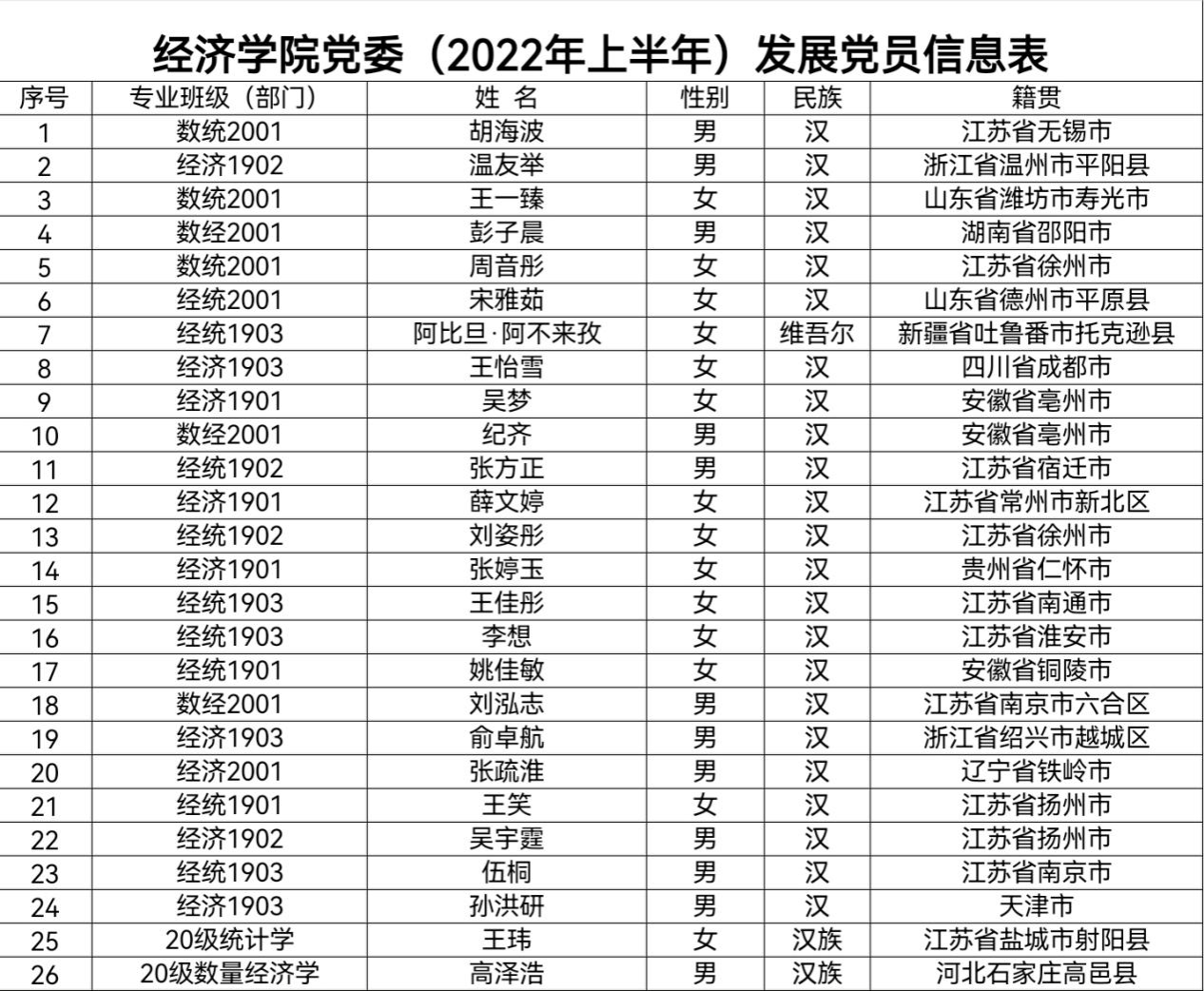根据《发展党员工作实施细则》有关规定,经学院基层党支部考察、学院党委预审,拟接收胡海波等26名同志为中共预备党员。现将名单予以公示:
