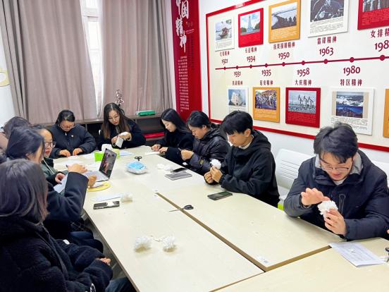 活动伊始,师生共同制作手花,几张抽纸,一折一捆一剪一撕,在大家的手中变成精致逼真的纸花,以这种寄托情感的载体形式,让无形的哀悼变得有形有情。昭昭前事,惕惕后人。大家将制作好的手花佩戴在左胸前,一起观看历史纪录片《勿忘国耻,警钟长鸣》,沉思缅怀曾经浴血奋战的革命先烈和无辜遇难的人民,并通过集体默哀,以沉痛的心情悼念亡灵,表达哀思。