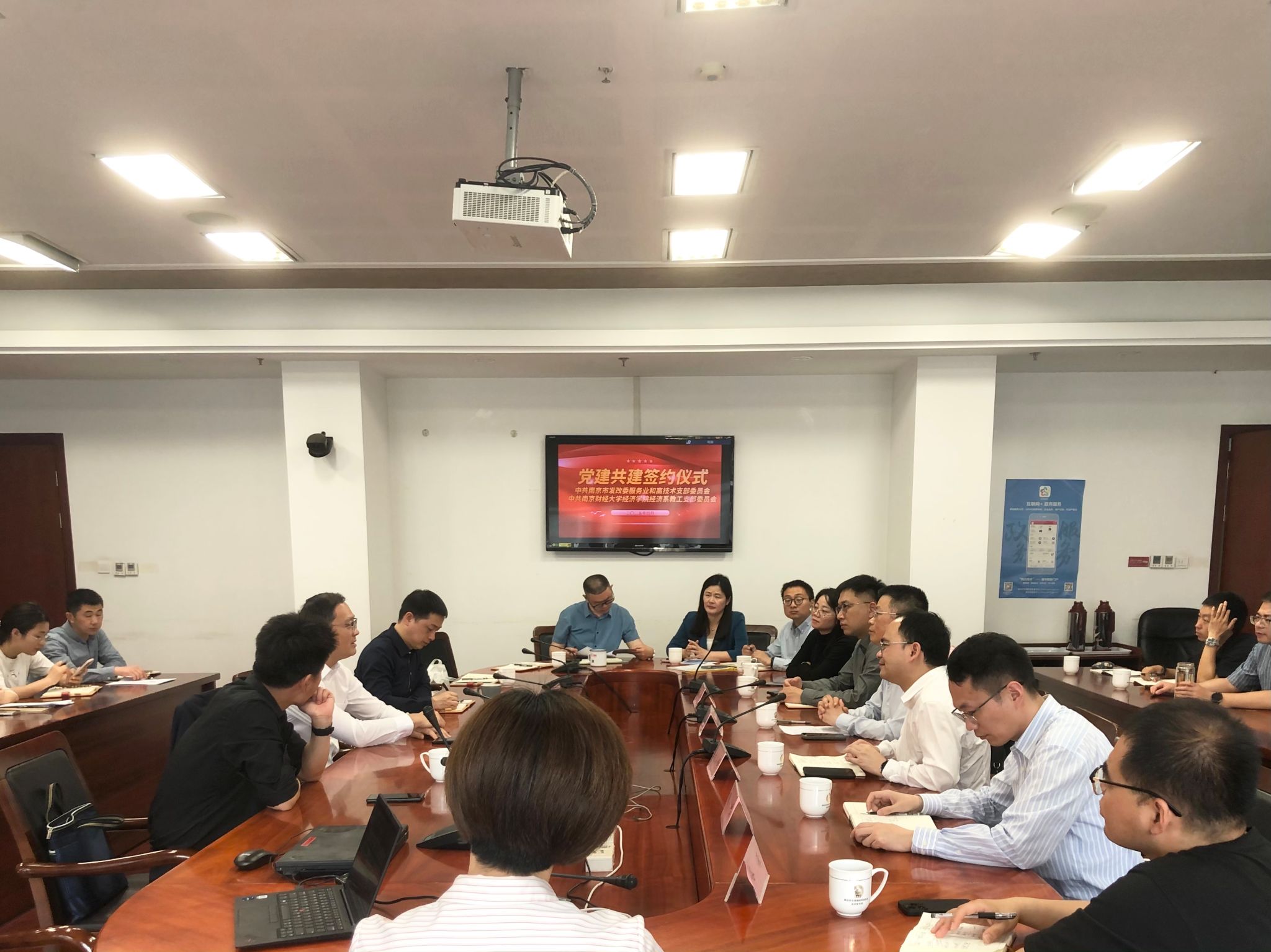 与南京市发展和改革委员会在新城大厦D座1869会议室联合举办党建共建活动暨政产学研对接交流会。南京市发改委党组成员、副主任贾尚斌,南京市发改委服务业和高技术发展支部书记、服务业务处处长胡耀,南京市发改委创新和高技术发展处处长赵勇,南京市发改委服务业和高技术发展支部相关人员参加会议,明星色情