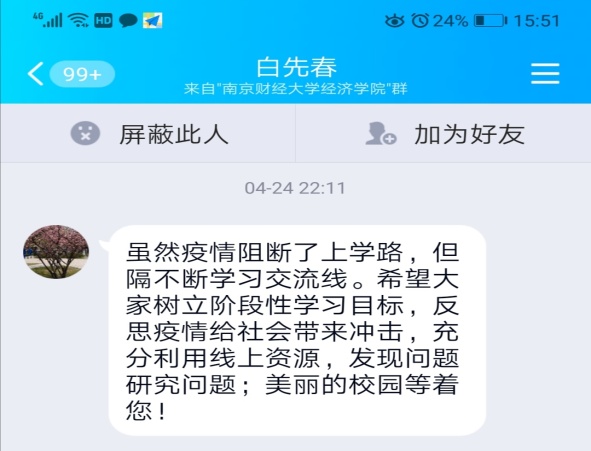 章莉老师说:疫情使导致我们不能在美丽的校园里、课堂上相见,欢迎同学们要高效地利用网络、自律自觉地学习,遇到困难可以随时与老师交流,学校和老师永远是同学们最坚强的后盾。