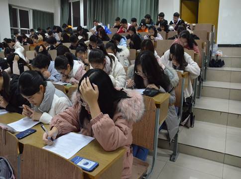 接下来,进入到活动的第二个部分——模拟大学英语四级考试环节。模拟现场气氛严肃紧张,听力部分结束后,同学们纷纷伏案作答,认真思考。答题完毕后现场以PPT形式公布答案,供同学们参考,通过比对了解自己在最近一阶段备考大学英语四级的效果,在接下来的时间里查缺补漏,在最后的复习阶段奋力一搏。
