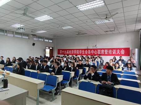 学生会各中心联席暨培训大会在德经楼117顺利召开。学院学生会主席团、各中心部长以及全体新志愿者们参加了本次大会。会议由综合事务中心熊美玲、戴文轩两位同学主持。