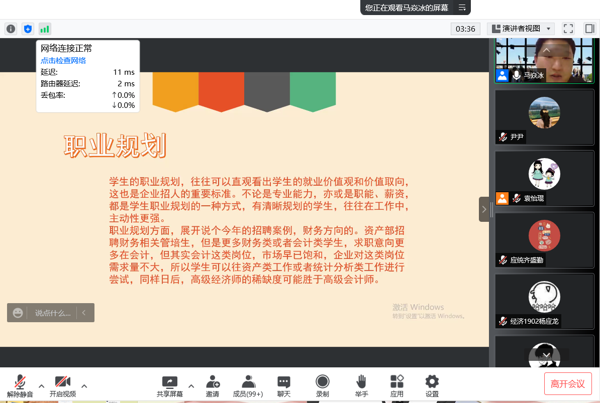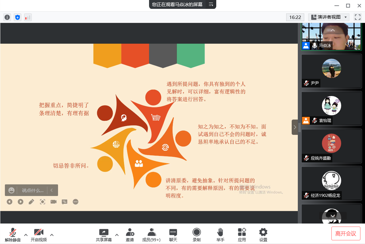 马焱冰从大学生就业方向展开讲述,他认为学生的专业技能、个人定位、忠诚度、职业规划和沟通能力都是企业特别看重的要素。在求职技巧上,他从面试的基本礼仪、语言表达技巧、回答问题技巧和避免紧张的技巧四个方面对线下线下面试的注意事项展开深入讲解,并就同学们关心的就业问题给出一一解答。