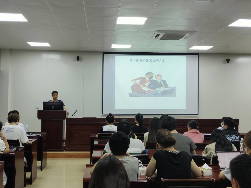 本次培训会分为调查方案的设计及调查方法两个模块进行。首先,柳杰民老师由调查方案的内容入手,从确定调查目的、界定调查对象、确定调查项目、确定调查方式和方法以及调查资料整理和分析方法五个方面展开讲解,通过往年带领团队参赛的经历,表明调研选题实用性、调查对象具体化、调研报告厚重化的观点,强调了调研方案应具备创新性、多样性和针对性。