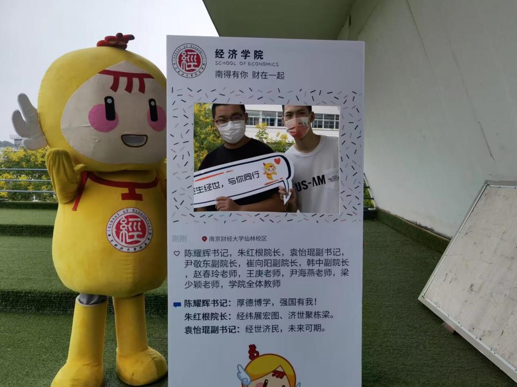 对每个新生的美好祝愿,希望每一个留下自己印记的新生都能度过美好的四年时光,不负年华,学业有成。初来乍到,新生难免有些羞涩,但对经院吉祥物小经灵发出的合影邀请,却没有人会摇头拒绝。在打卡框下,是明星色情
