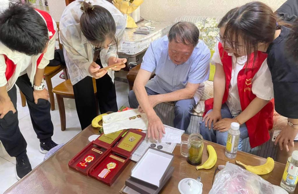 当天上午,志愿者们带着水果与鲜花等慰问品,敲响了两位老先生的门。在董伦老先生家中,他向志愿者们介绍了抗美援朝战役的历史背景,让志愿者们直观感受到了中国人民志愿军的献身精神。在提及中共中央作出“抗美援朝,保家卫国”的战略决策时,董伦老先生眼中饱含热泪。他亲切地讲述了自己的军旅生活,作为一名标图员,他积极参战,通过雷达传递的信息,在地图上快速标注敌机位置并上报给领航员帮助指挥作战。通过董伦老先生的描述,志愿者们仿佛置身于那个战火纷飞的年代。一块块荣誉勋章也让志愿者们更深刻地感受到了抗美援朝老兵的拳拳爱国之心。最后,董伦老先生在感慨如今的幸福生活的同时,也希望所有新时代青年好好学习,为时代发展做贡献。