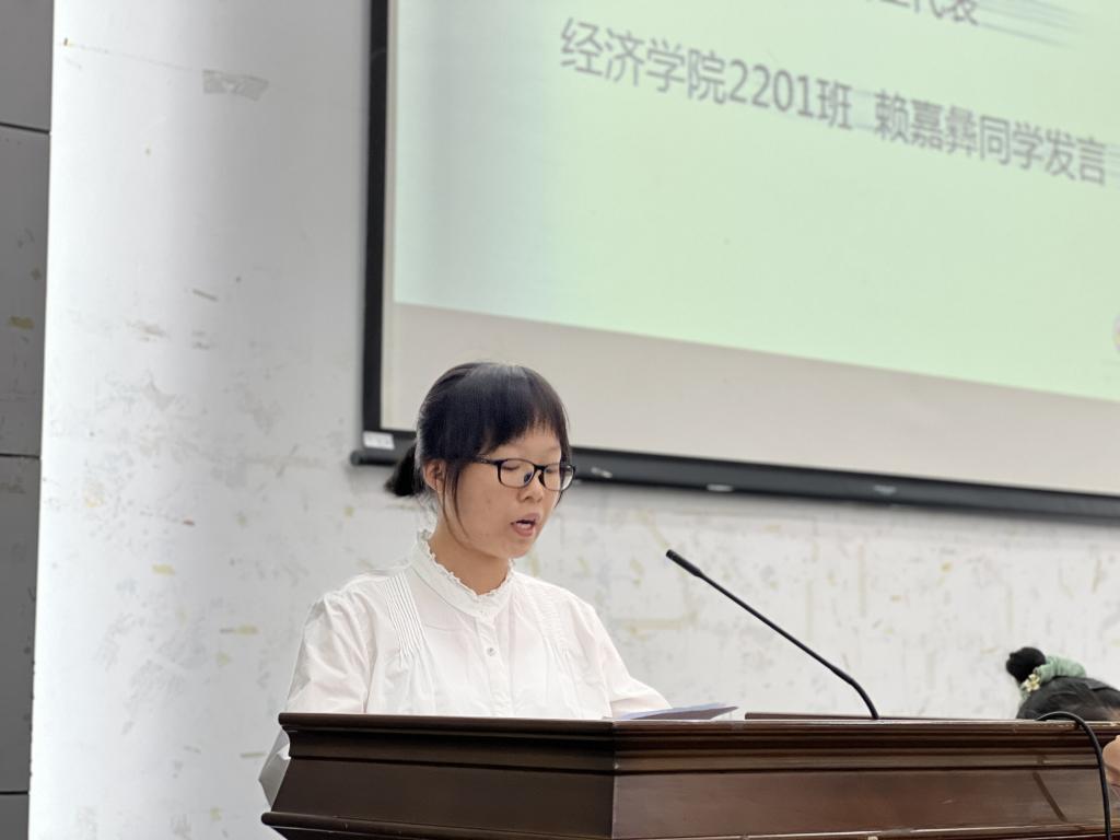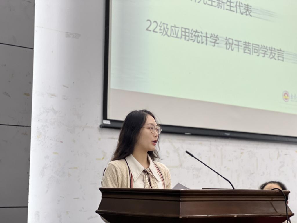 的沃土中,练就出过硬的本领,创造出更加辉煌的明天。本科生新生代表2201班赖嘉彝号召全体新生珍惜时光,把握机会,且行且思,不驰于空想,不骛于虚声。在对专业的潜心学习中,掌握知识,播种热爱,收获喜悦,不坠青云之志,永存赤子之心。研究生新生代表2022级应用统计专业祝千茜从自主性和创新性两个方面表达了对研究生阶段的向往和期待,希望在新的求学之路上活出卓越与非凡、充实与精彩。