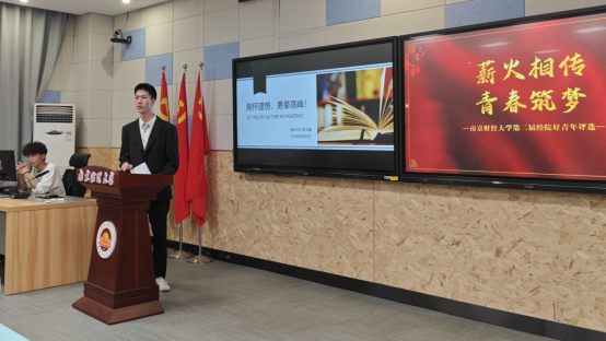 评选现场,参赛选手们依次上台,围绕“薪火相传,青春筑梦”主题结合PPT进行精彩演讲。他们中有心怀崇高理想和远大抱负的“责任担当”青年,有肯付出、勇担当、讲奉献、做表率的“奉献精神”青年,有努力学习、艰苦奋斗的“求实进取”青年,也有勇于开拓、执着追求的“自立自强”青年。他们以自信昂扬的精神面貌展示各自卓越非凡的学术表现、广泛深入的个人历练、不遗余力的志愿奉献、扎实务实的实践探索和扎根时代的未来憧憬,充分展现了经院学子以青春时光投身南财发展与时代进程同频共振激情昂扬的斗志,秀出经院青年的风采与担当。现场评委秉持公平公开公正原则,共同对选手的表现进行点评打分。