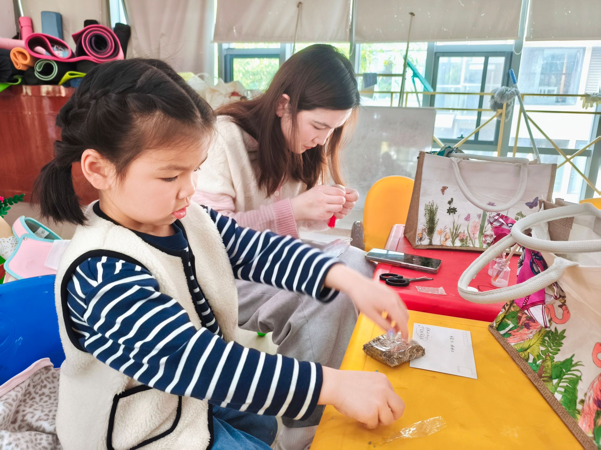 此次活动还特别设置了手绘帆布包亲子项目。同学们邀请现场的母亲和孩子们一同参与,孩子们面对色彩丰富的画布兴致勃勃,手中紧握胶水展开创意制作,母亲们则默默陪伴给予支持,现场充满温馨与欢乐。