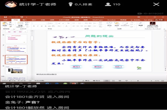 经过多年的建设和发展,《统计学》课程已在中国大学MOOC上构建了完善的课程体系,并于2018年被评为“国家精品在线开放课程”。丁辉博士首先在第一节课组织学生认真观看了中国大学MOOC网上关于假设检验部分知识模块,随后在第二节课在QQ“群课堂”内针对该知识模块再次进行细节讲解和总结,并通过线上练习的方式对学生进行知识点考查。整个授课过程进度合理,教师情绪饱满,解释详细,与学生互动密切,“云听课”的老师们也深受启发,对丁辉博士的授课形式安排和授课效果表示了高度肯定。
