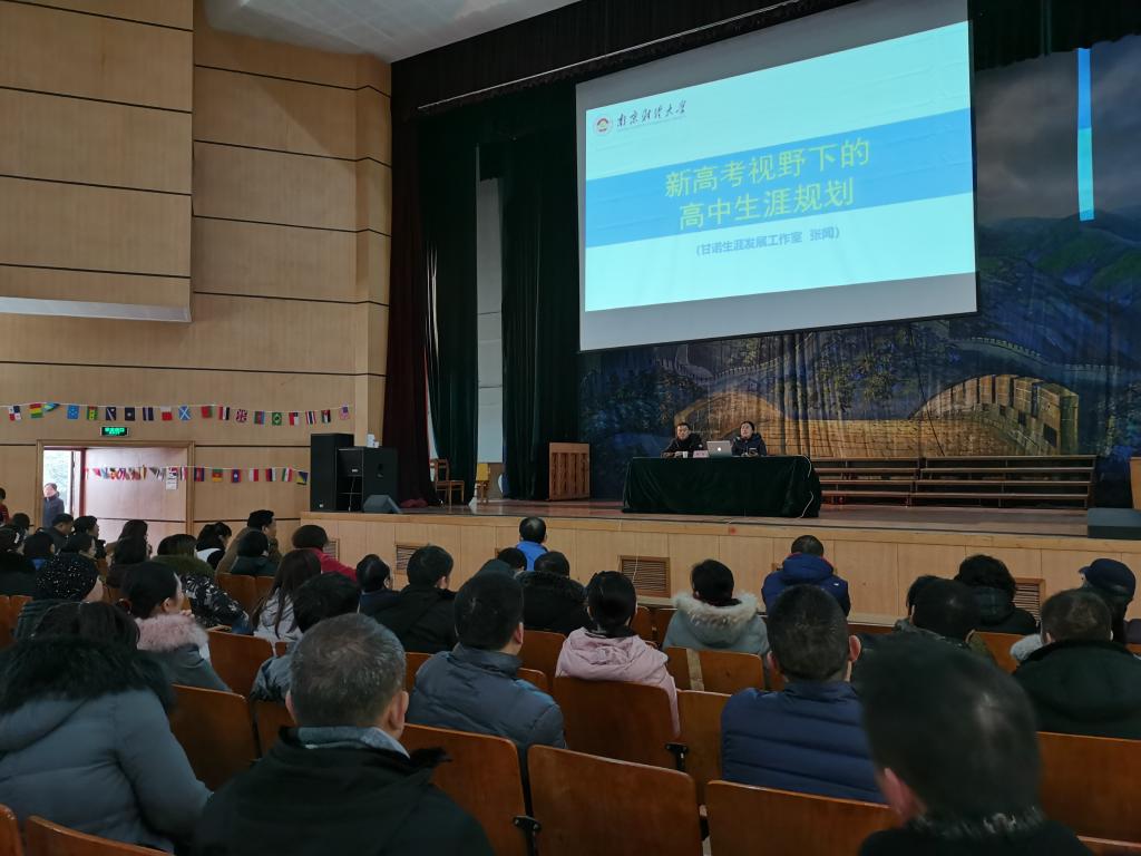 党委副书记袁怡琨老师带领招生咨询团队,前往我校优质生源基地——徐州市第一中学,走进该校“家长课堂”,开展主题为《新高考视野下的高中生涯规划》讲座,向高一、高二学生家长解读新高考政策,吸引200余名学生家长参加。