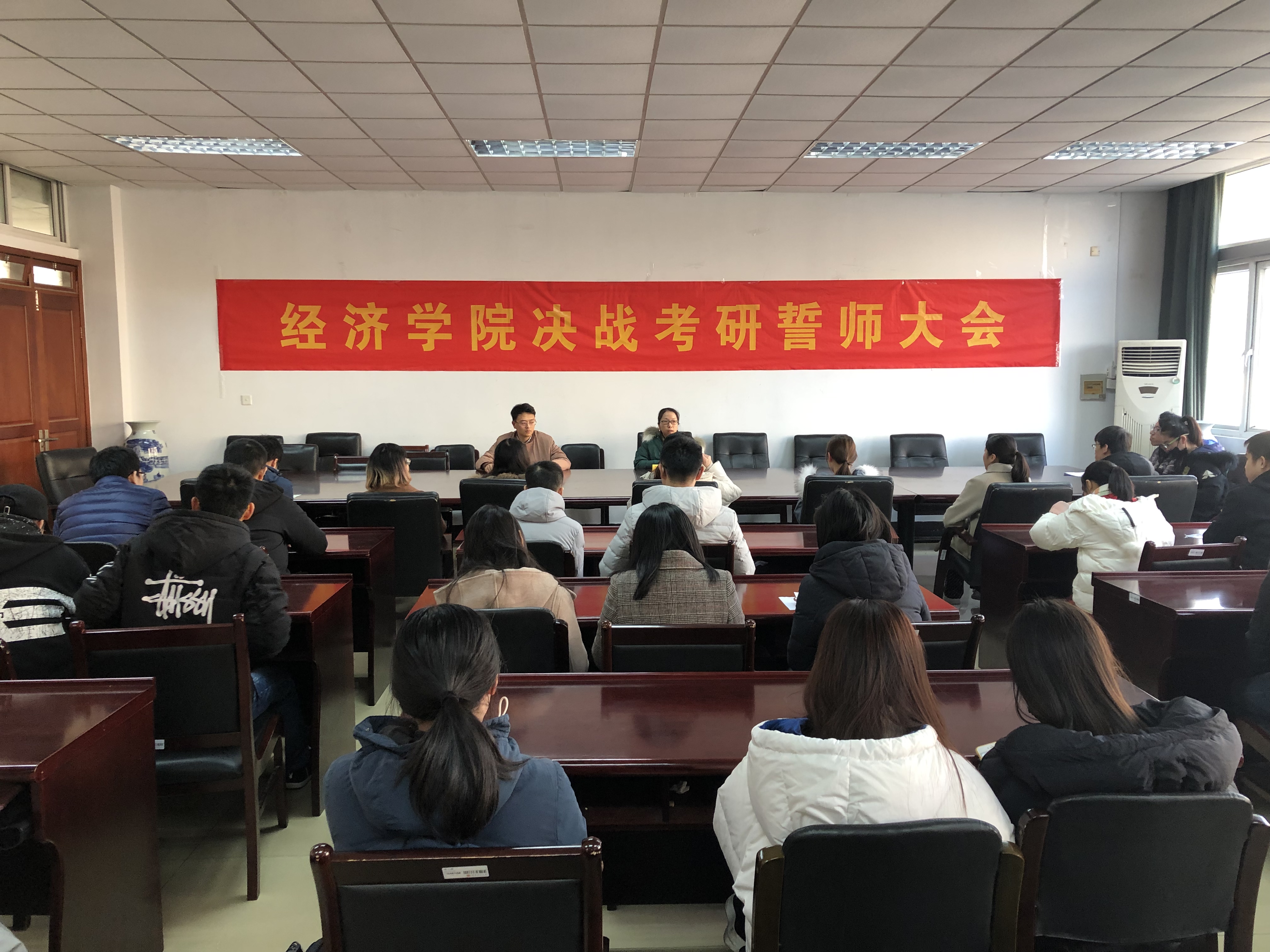 在德经楼307室召开2019届学生决战考研誓师大会,大会由党委副书记袁怡琨主持,副院长张成、学工秘书尹海燕、毕业班辅导员徐昊翔和部分考研学生参加大会。