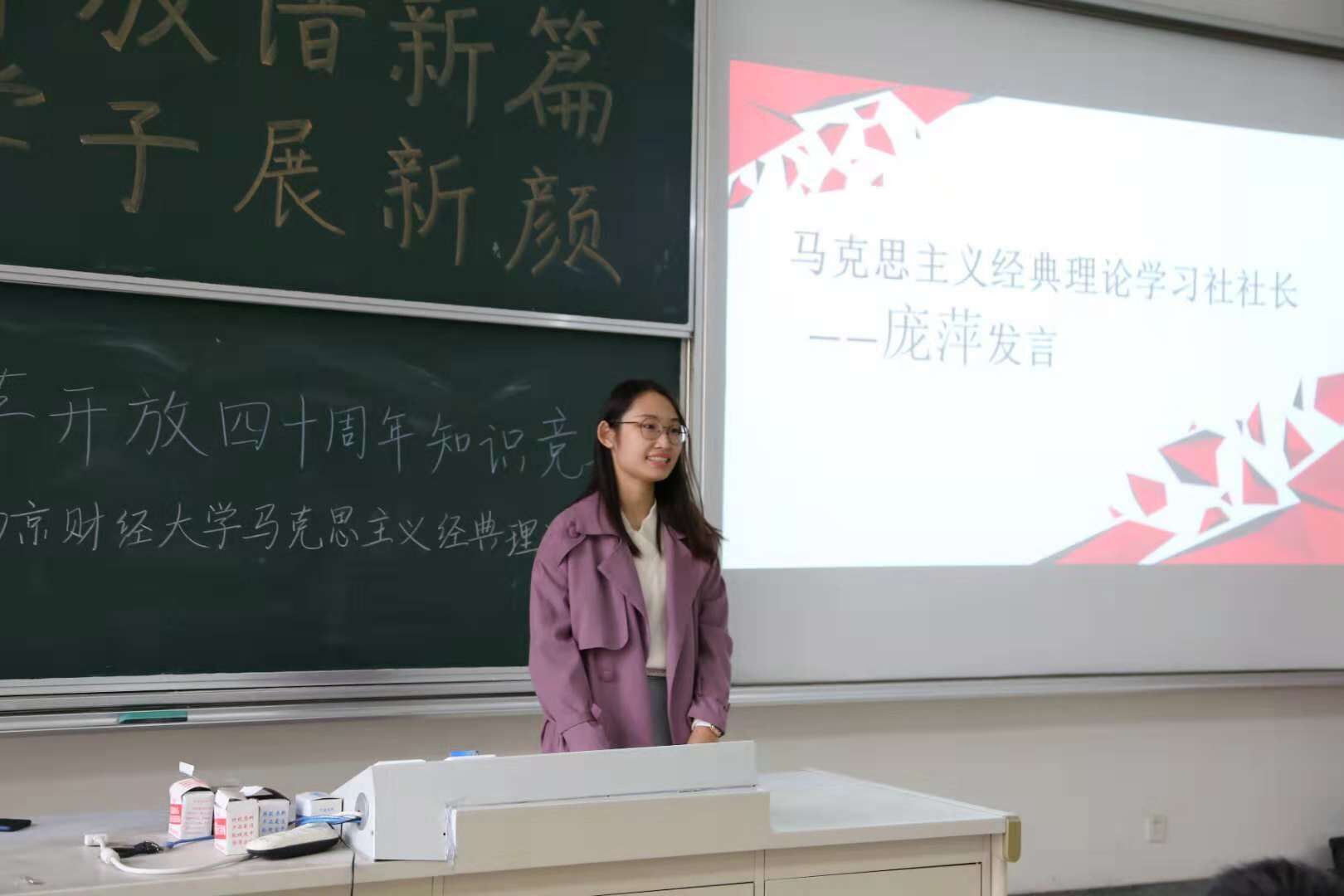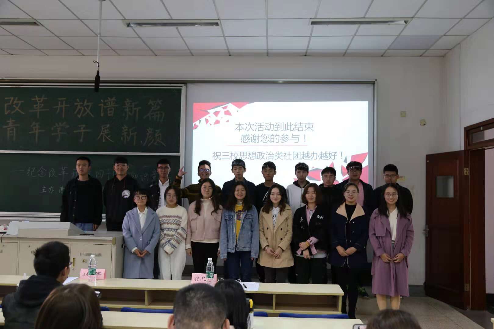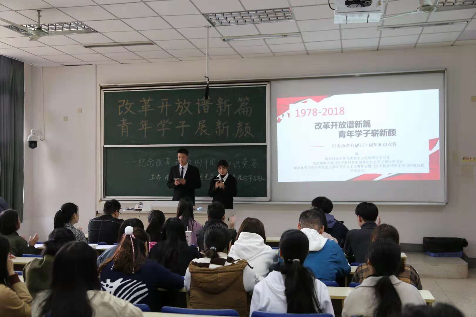 11月11日下午,明星色情 马克思主义经典理论学习社联合南京邮电大学习近平新时代中国特色社会主义思想学习会、南京体育学院习近平新思想学生学习研究社,在德经楼101举行了“改革开放谱新篇,青年学子展新颜”——庆祝改革开放四十周年知识竞答活动,明星色情 党员、入党积极分子们到场观看了比赛。 活动正式开始前,明星色情 马克思主义学社社长庞萍、南邮习学会会长吴忧、南体马院新思想研习社团社长翁凡棋依次进行了发言。首先,庞萍同学以主办方身份对来自南邮、南体的社团同仁们表示了热烈的欢迎和衷心的感谢,同时对此次知识竞答活动提出了要求和期望,并表示希望今后加强三校思想政治类社团的交流与合作。吴忧同学对社团的未来发展方向提出了热切展望,翁凡棋同学则表示希望加强社团间的联系并欢迎兄弟院校社团去南体进行交流。 本次庆祝改革开放四十周年知识竞答活动分为必答题、抢答题和风险题三个环节。选手们一个个你追我赶、不甘示弱,对改革开放四十年的历史都有较好的理解和掌握,场上竞争十分激烈。经过激烈的角逐,南财队获得了卓越青年奖,南邮、南体则分别精神文明奖和思想进步奖。活动最后进行了各队的颁奖和合影环节。 此次改革开放四十周年知识竞答宣扬了改革进取的创新精神,促进了青年学子对相关历史的深入了解,展现了当代青年学子积极向上的精神风貌。
