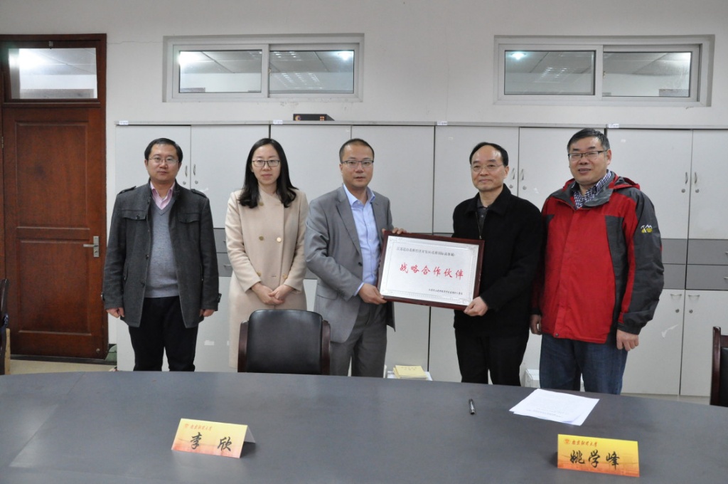 大数据研究的基本情况;李欣副镇长介绍了花桥人才工作以及应届生招聘工作开展的基本情况,表示将在大数据研究、学生创业支持等方面加强与我校的合作;李欣副镇长与姚学峰处长签订了战略合作协议,并授予我校大学生就业指导中心江苏昆山花桥经济开发区战略合作伙伴铜牌。