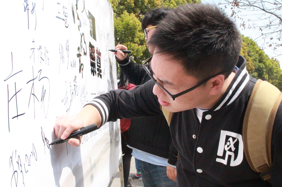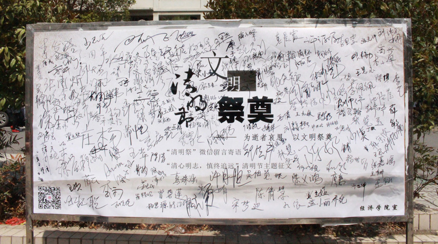 官方微信“南财小经灵”上滚动播放的留言。 “网络祭扫比敬献鲜花还要环保,支持!”…… “绿色过清明”的现场宣誓会上,同学们也踊跃参加,认真地签上自己的姓名以支持绿色祭扫,其中也不乏老师们的身影。不一会儿,大大小小的名字写满了宣誓板。一位吴姓同学表示:“我会过一个绿色的清明,也还要告诉家里人让他们也参与进来”。
