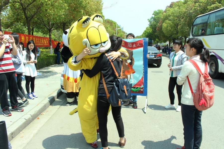 学生会举办的“你好,陌生人”温暖校园活动在学校西苑举行。穿戴可爱玩偶服的志愿者们举着“亲,来抱抱吧”和“我可以抱你吗?”的牌子,给来往的同学们送上拥抱。一个个温暖的拥抱,让情感在彼此间传递。