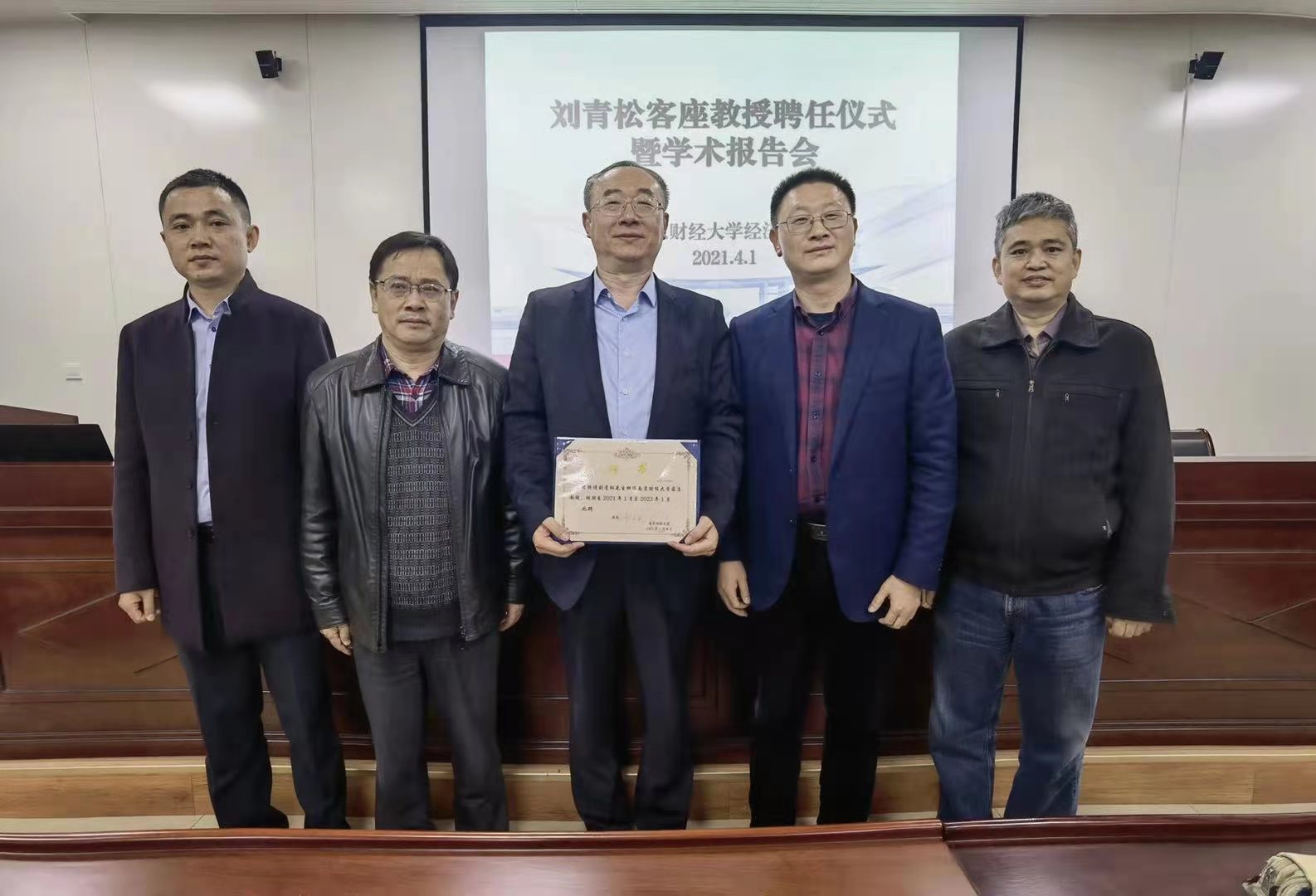 刘青松客座教授聘任仪式暨学术报告会在德经楼307会议室举行。学院副院长尹敬东、崔向阳、韩中及部分师生出席仪式,仪式由院长朱红根主持。