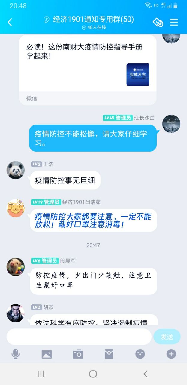 积极组织广大师生开展疫情防控知识学习。学院领导班子高度重视,带头学习,率先垂范,迅速部署推动,覆盖全体教职工和学生。前期广泛动员开展自学,通过微信群、qq群发布防疫知识文章、视频等学习材料。教职工以经济系、统计系和行政人员为单位分别开展线上集中学习,学生以班级为单位开展线上集中学习讨论,迅速掀起疫情防控知识学习热潮。经济系教工制作了疫情防控在线考试系统,通过测试进一步巩固学习效果。