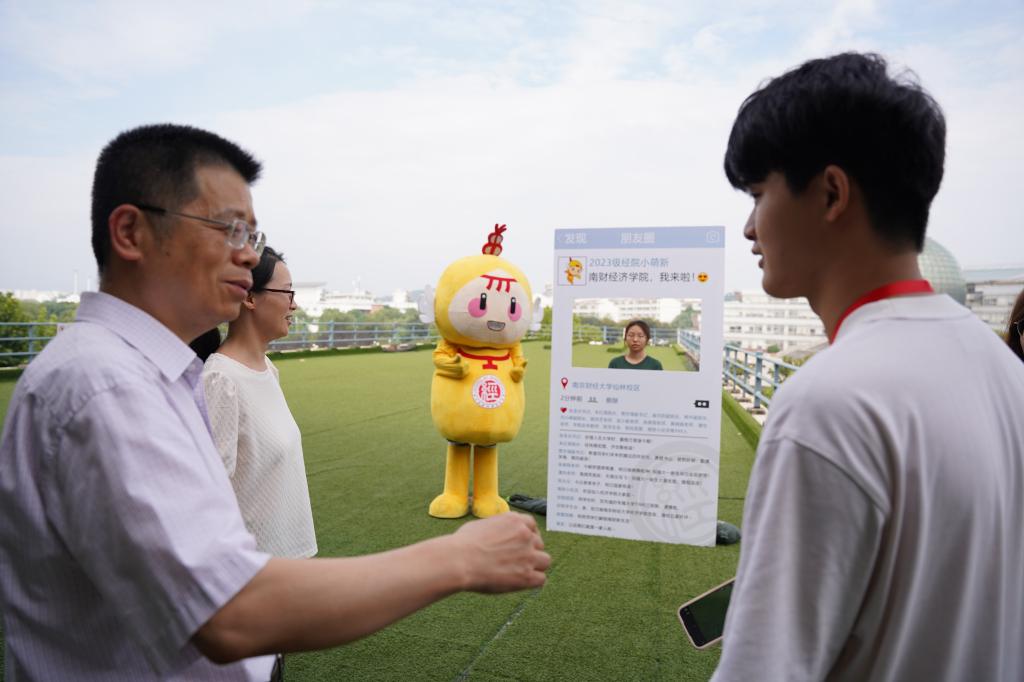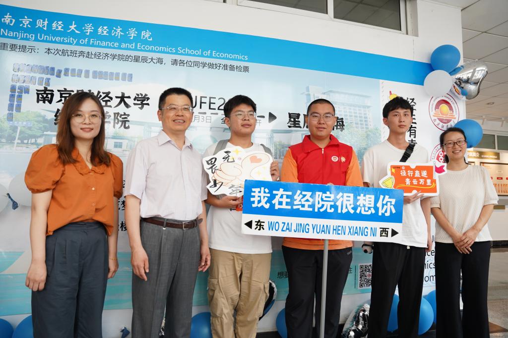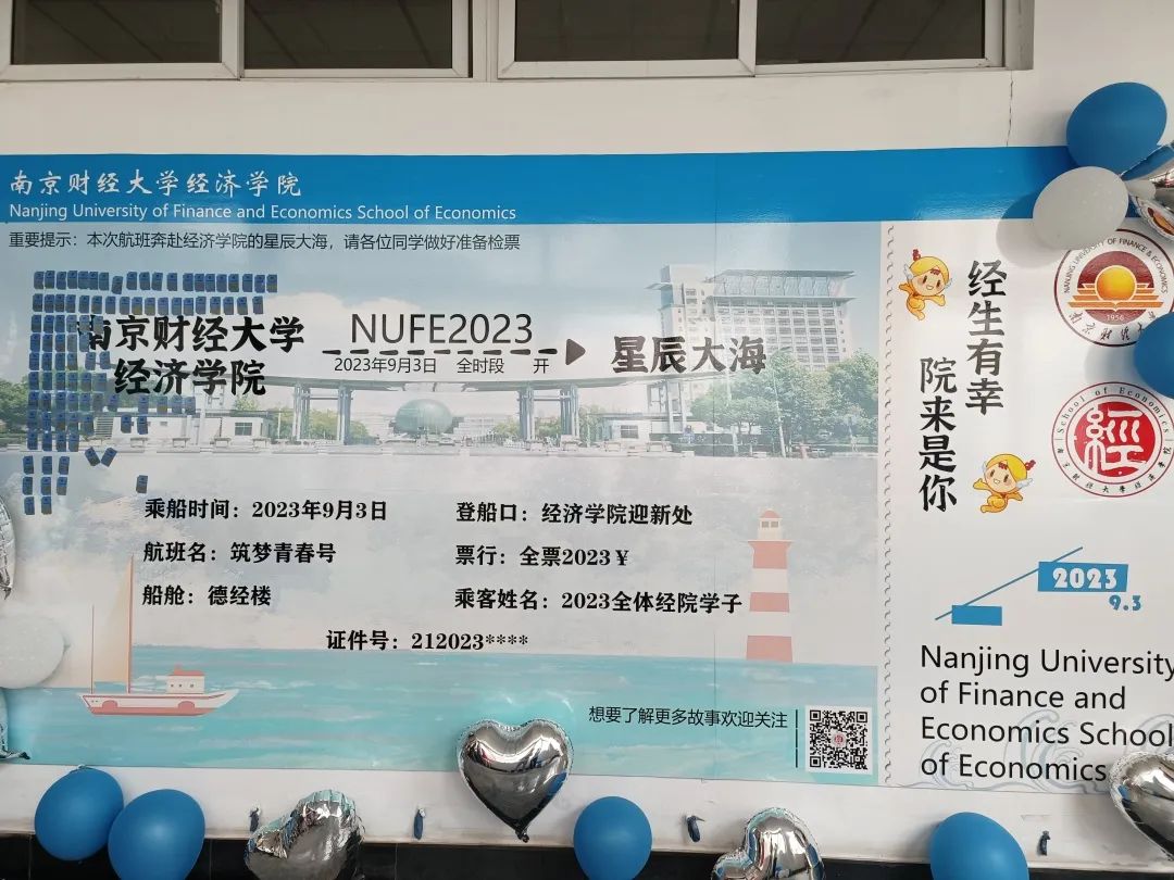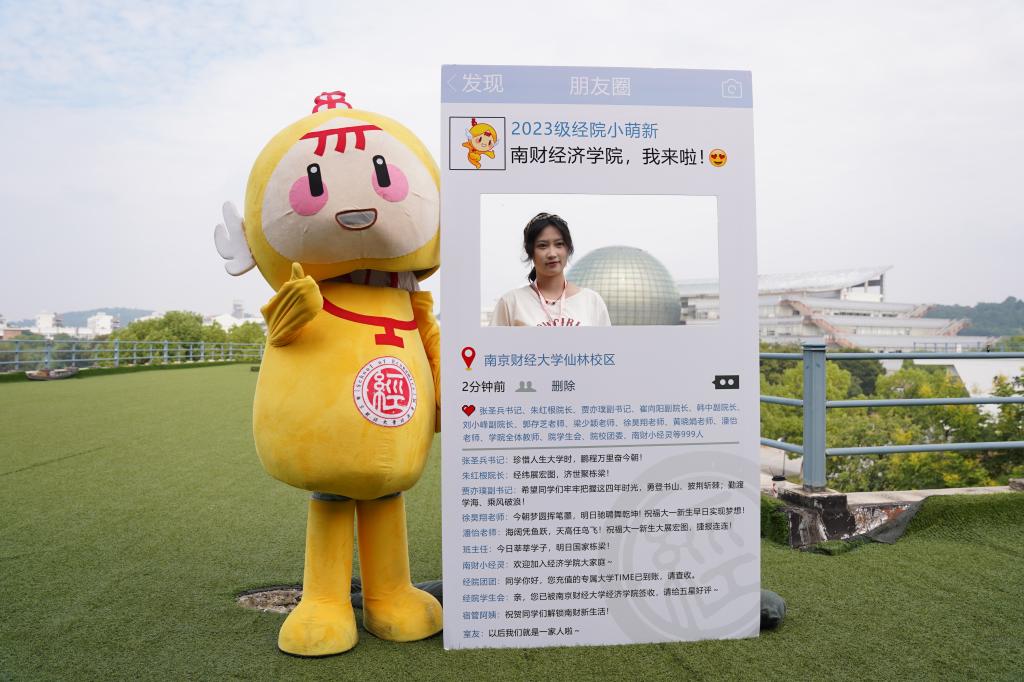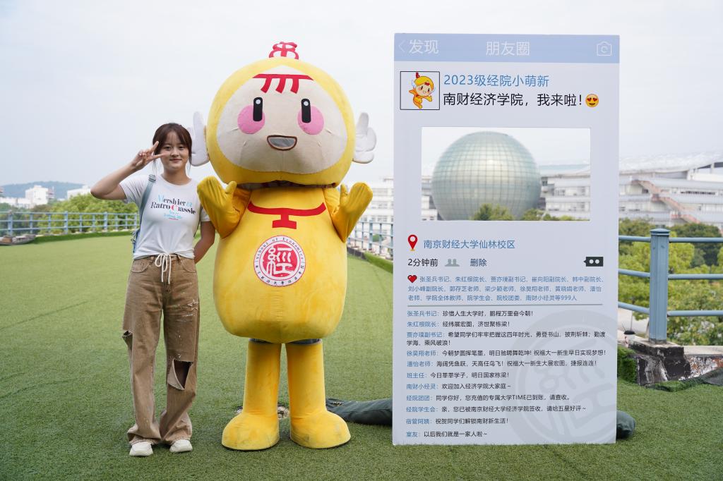 启航驶向星辰大海的“逐梦青春号”船票展板,学院的专业楼德经楼为船舱、新生们的学号为证件号,寓意经院学子们登船开启为期4年的学习时光,乘风破浪,扬帆远航,逐梦新征程。学子们在船票票根写下求学寄语并签名后粘在迎新墙上,更增强“榜上有名”的仪式感。学院还精心为新生准备了富有经院特色的入学纪念品,包含“小经灵”钥匙扣、船票票根、南财明信片、新生防诈骗指南以及定制帆布包等,通过温馨礼物的方式密切学生和学院的联系、培养爱校情怀,可谓仪式感满满!新生们纷纷与写满学院领导老师点赞留言的朋友圈打卡框、学院吉祥物“小经灵”和南财地标图书馆“大球”合影,开启缤粉多彩、有滋有味的大学生活。