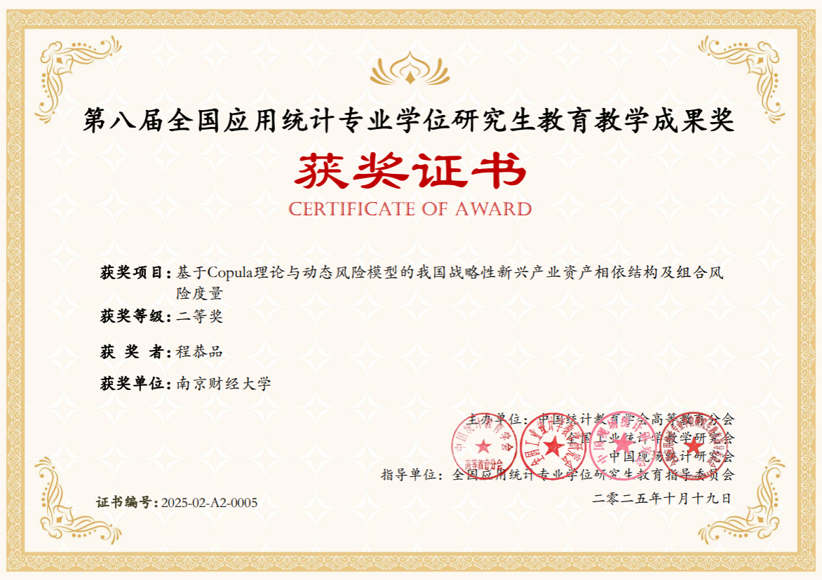 1.获奖项目:基于Copula理论与动态风险模型的我国战略性新兴产业资产相依结构及组合风险度量;获奖等级:一等奖;获奖者:刘胜男、郝思雨、黄帅;指导教师:程恭品