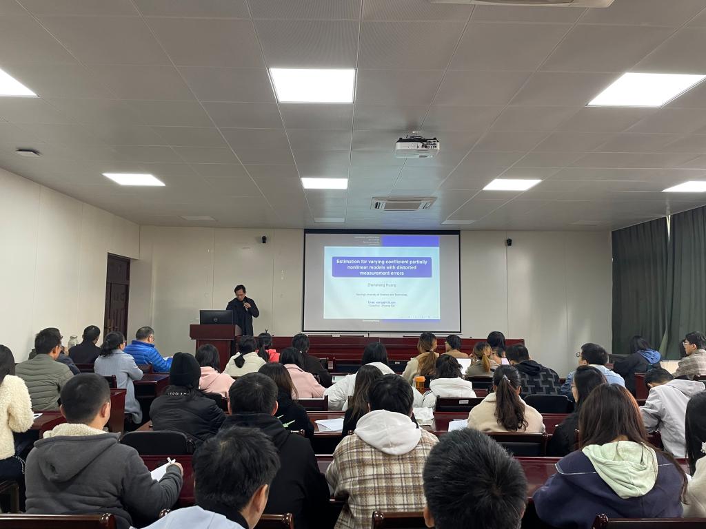 首先,黄教授讲述研究背景与动机。在经济、医学、金融等领域,收集数据经常会有测量误差,如果不加以处理会影响推断结果。其中,扭曲测量误差是一类比较复杂的误差,黄教授通过糖尿病和尿毒症的例子向我们详细讲述混淆变量的扭曲测量误差。随后,对于如何处理这类混淆变量,黄教授提出了常用的乘积形式的扭曲测量误差的形式,并对其加以改进。他向我们具体讲述了具有扭曲测量误差的变系数半线性回归模型的非参数估计方法。紧接着,黄教授展示了该估计的大样本理论性质,并用模拟方法验证了该理论结果。最后,黄教授用经典的波士顿房价数据检验模型,并与其他已有模型比对。