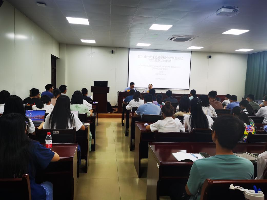 于教授首先阐述了在数字时代,人工智能不仅是技术的突破,还对社会组织结构、科学范式、企业营业商业模式、个人生活方式、政府治理模式造成结构性改变,是一个全面的社会结构的变化。在这一背景下,传统的农业经济学研究已经落后于社会与时代,强调人工智能及其研究对农业经济学的革命性影响,数据已经成为重要的“生产要素”和“资产”。其次重点强调在新的数字时代,面对新的问题,研究的对象、方法,理论均需改变,我们应考虑用最先进的方法进行农业经济学的理论创新及实证方法革新。他以雨伞的故事为例,具体分析了数字时代的机器学习与传统的计量经济学之间的异同,说明了计量经济学所研究的中心极限定理已经过时,统计学与计量经济学面临理论与实证的危机。他指出,在数字时代需要进行机器学习,并介绍了机器学习的主要任务,包括识别与预测、聚类和信息提取、博弈等方面知识,师生们深刻感受到了人工智能正给我们生活带来的巨大变化。最后于教授勉励大家要学会正确看待人工智能,拥抱现实,接受挑战,思考未来发展方向。在互联网时代不断学习成长,学到更多本领,在未来的就业局面里不落巢窠。