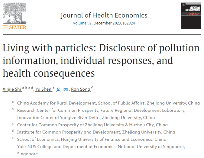 青年教师沈煜博士以通讯作者的学术论文“Living with particles: Disclosure of pollution information, individual responses, and health consequences”在Journal of Health Economics在线发表,以第一作者的学术论文“The effect of low-carbon city pilot on energy consumption behavior: Evidence from China”在Energy Economics在线发表。