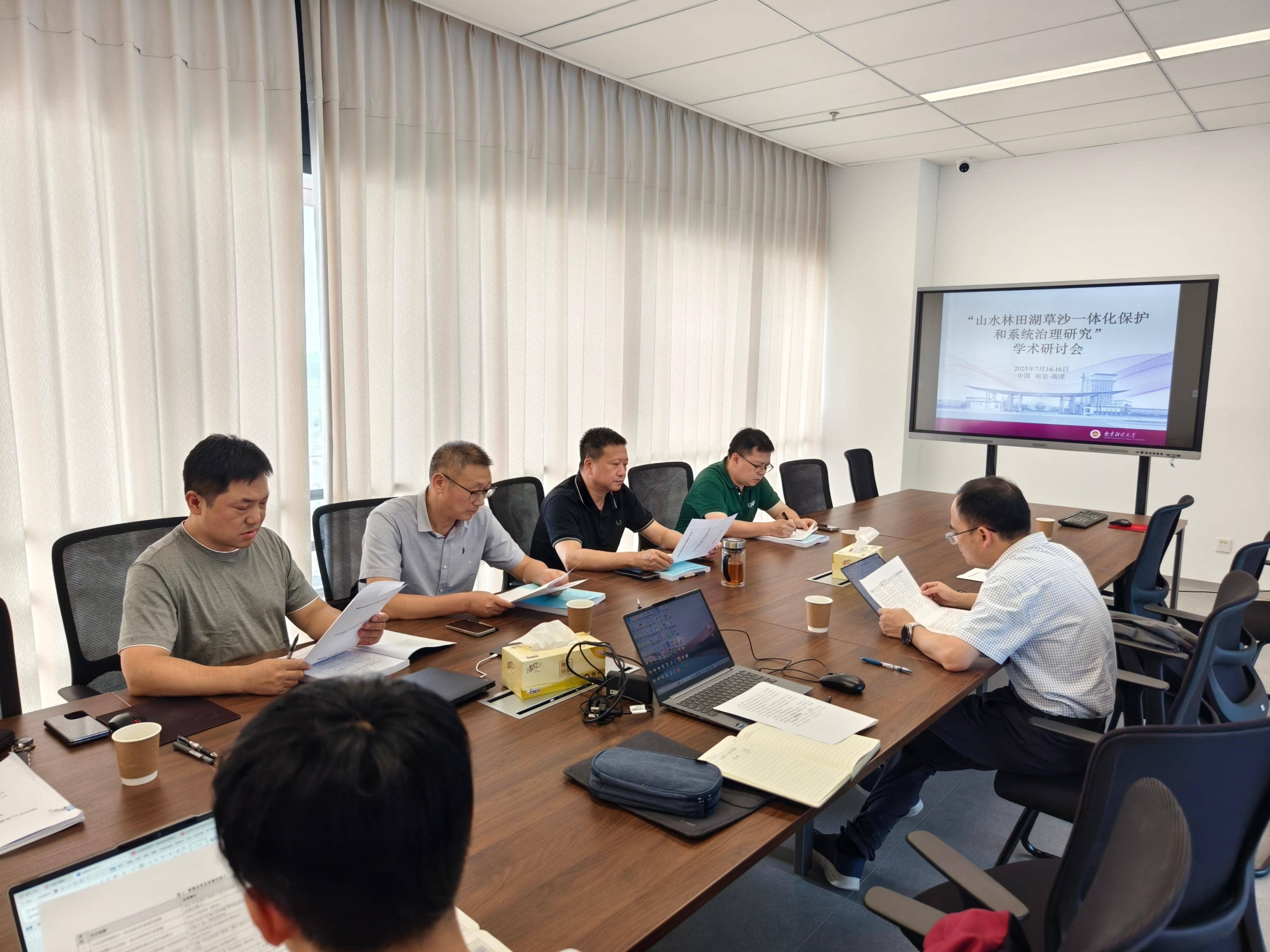 首先,张利民教授详细汇报了中国生态保护治理的系统性理念及其内涵释义、从学理层面阐释了山水林田湖草沙一体化保护的系统性逻辑和丰富意蕴,为理解山水林田湖草沙一体化保护和系统治理提供了一个详实的理论框架;其次,何欢教授围绕山水林田湖草沙一体化保护和系统治理的运行框架、实现机制进行深入探讨,主要内容包括对相关政策发展脉络的梳理、山水工程的政策设计与制度安排、山水林田湖草沙一体化保护的实现逻辑等等;王进主任分享了实地调研经验,并通过多案例比较分析的方法总结了山水林田湖草沙一体化保护的典型实践模式和存在的主要问题,为优化山水林田湖草沙一体化保护和系统治理运行机制和实现路径提供了经验支持;朱红根教授分享了“山水工程”实施效果的最新成果,包括“山水工程”试点政策对县域经济高质量发展、农业绿色发展、企业ESG表现的影响等等。最后,刘小峰教授围绕山水林田湖草沙一体化保护和系统治理的政策优化、组织保障机制、资金保障机制、科技保障机制作了详细的汇报。主题汇报后,各位专家围绕山水林田湖草沙一体化保护和系统治理的现实困境、实现路径和未来研究方向分享了建设性意见,现场学术氛围浓厚。此次研讨会为山水林田湖草沙一体化保护的进一步研究提供更多的研究思路,也为全球山水林田湖草沙系统治理的学术研究贡献重要力量。