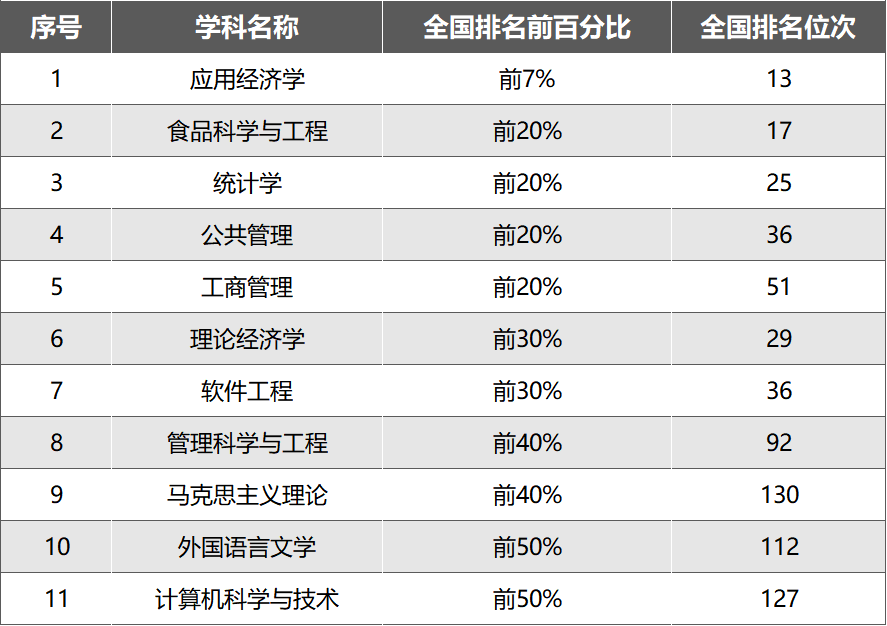 近日,高等教育评价专业机构软科发布“2023软科中国最好学科排名”,我校共上榜11个学科,分别为应用经济学、食品科学与工程、统计学、公共管理、工商管理、理论经济学、软件工程、管理科学与工程、马克思主义理论、外国语言文学、计算机科学与技术。其中,我校应用经济学学科位列全国排名前7%,食品科学与工程、统计学、公共管理、工商管理四个学科位列全国排名前20%。