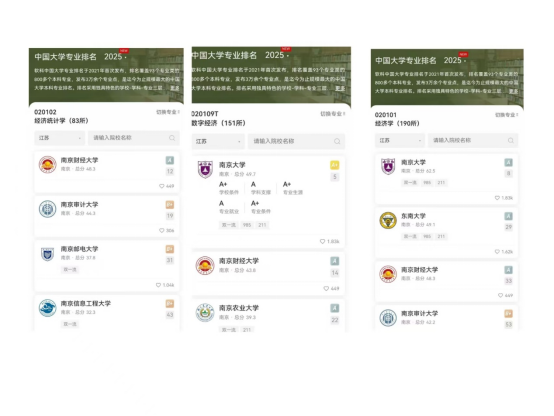 3个本科专业全部上榜,均为A类专业,实现大满贯。其中,经济统计学专业排名全国第12名,江苏省第1名;数字经济专业排名全国第14名,江苏省第2名;经济学专业排名全国第33名,江苏省第3名。