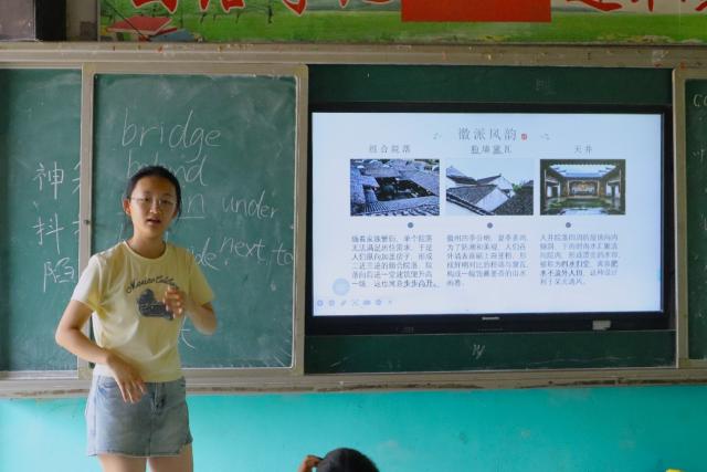 早上,一节别开生面的支教课程在肖水英老师的带领下拉开帷幕。老师首先向同学们介绍了中国古建筑的八大派系,并通过趣味小测试激发大家对古建筑的浓厚兴趣。随后,老师巧妙地通过“安徽省”中的“徽”字,引出了今天的主题—徽派建筑。